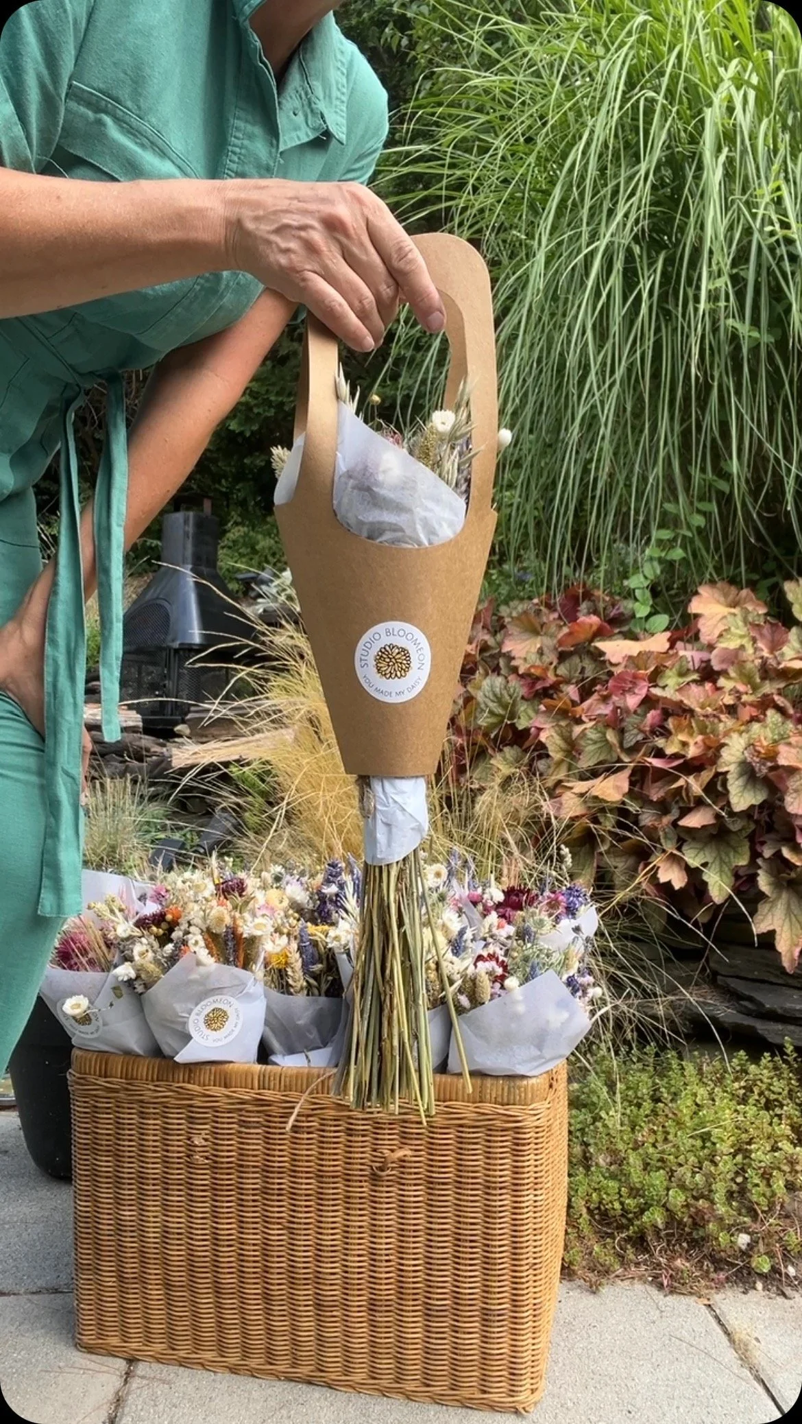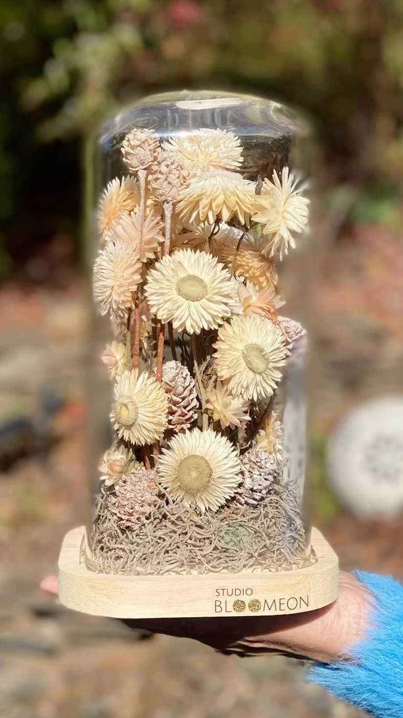 A typical Studio Bloomeon bouquet features a delightful blend of different flowers and grass varieties, meticulously handpicked within the confines of my intimate studio in Haddonfield, New Jersey. The flowers featured in our bouquets and various products are sourced both internationally, primarily from Europe, and locally from various farmers. Some of our arrangements feature the unique touch of a signature peacock feather. In addition to our signature bouquets, the Studio Bloomeon product lineup extends to enchanting wreaths, elegant glass domes, charming glass box candle holders, and festive Christmas ornaments, all filled with preserved dried flowers.